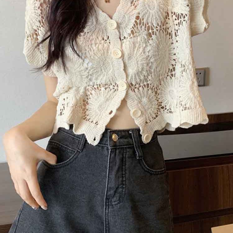 鏤空短袖開衫薄款女夏季小披肩配吊帶裙外搭蕾絲坎肩冰絲防曬罩衫