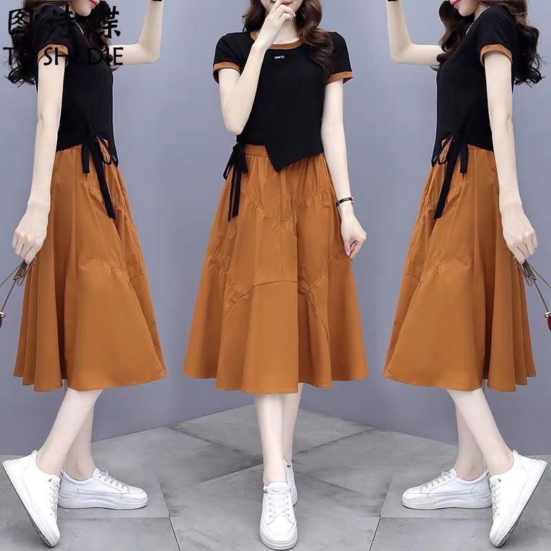2023新款胖妹妹兩件套女夏季連衣裙氣質K修身遮肚顯瘦中長款裙子
