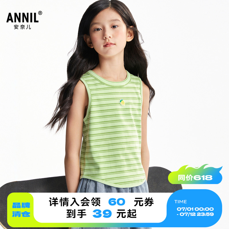 安奈兒童裝女童圓領無袖背心2025夏新款甜美撞色條紋彈力清新潮流