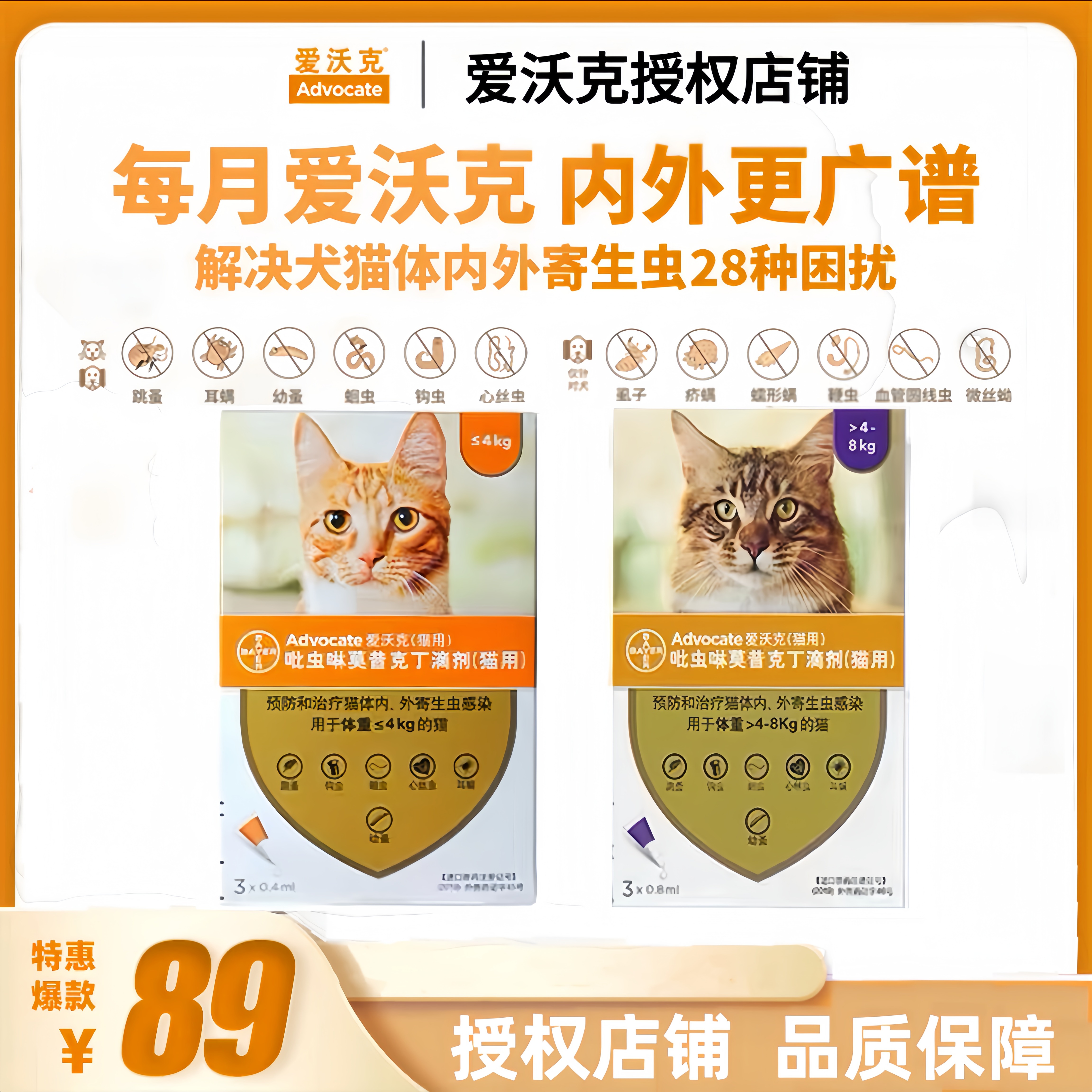 拜耳愛沃克貓咪驅蟲藥體內外一體同驅成貓幼貓體外寵物專用滴劑藥
