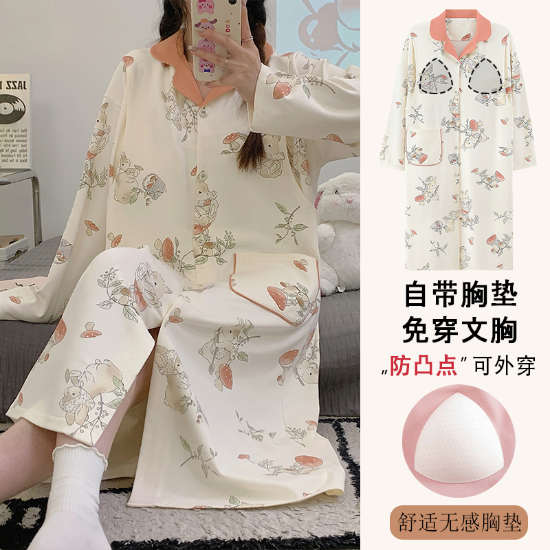 哺乳睡裙帶胸墊春夏長袖月子服待產裙產后孕婦睡衣莫代爾棉連衣裙