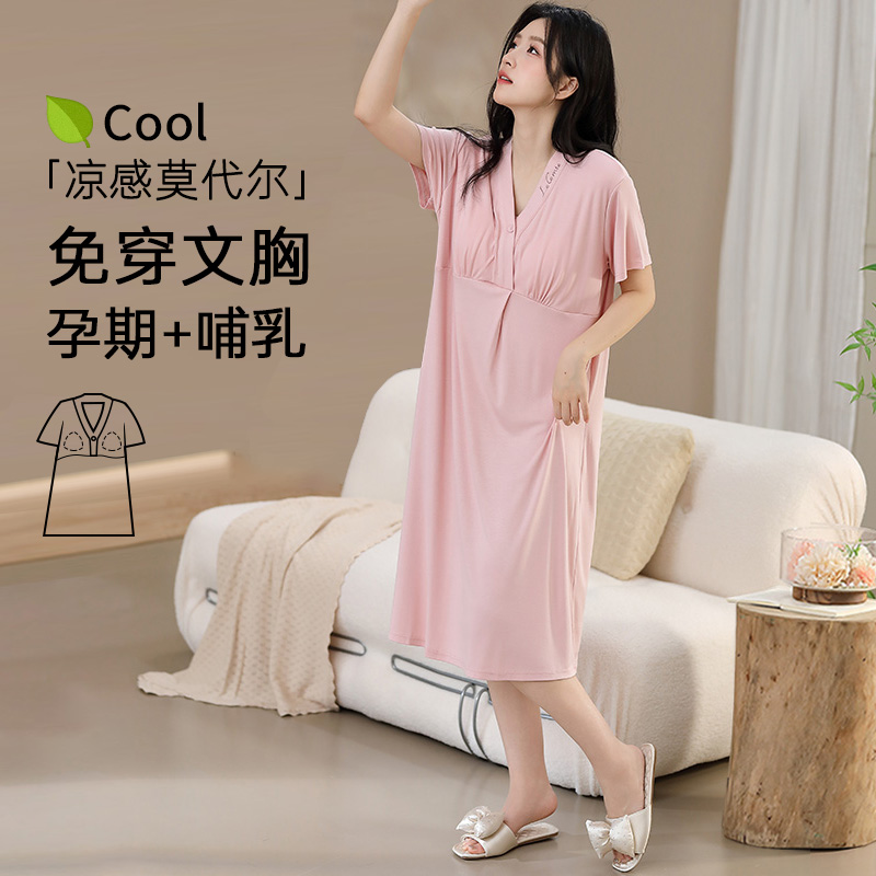 莫代爾月子服待產裙夏季哺乳睡衣帶胸墊薄款生產孕婦裙進產房入院