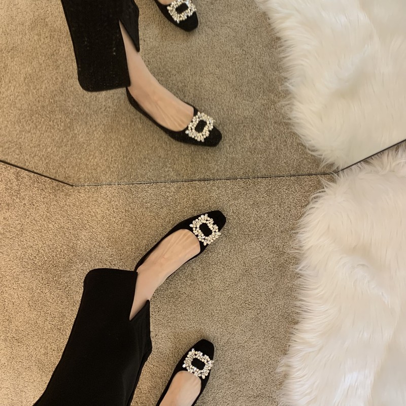 香港平底單鞋女2023年夏季新款一E腳蹬時尚方頭水鉆扣漆皮淺口甜