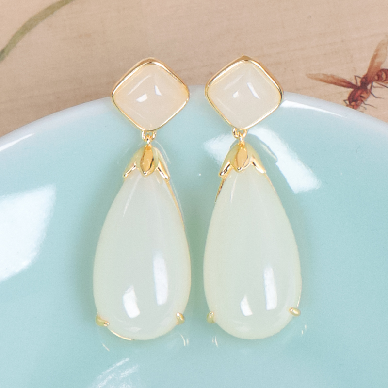 925銀鑲嵌和田玉晴水細糯羊脂白潤水滴耳環一對送媽媽送愛人