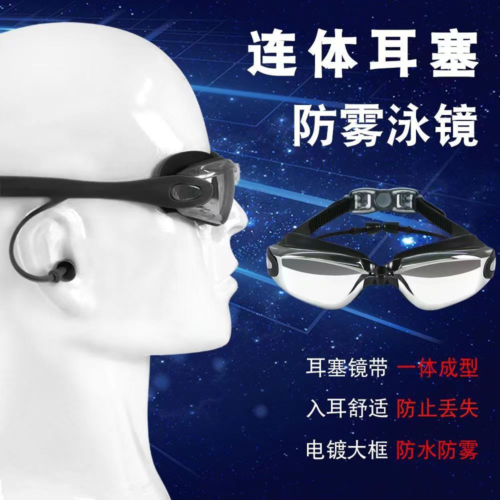 青少年泳鏡耳塞一體男女士高清防霧防水平光電鍍大框游泳護目眼鏡