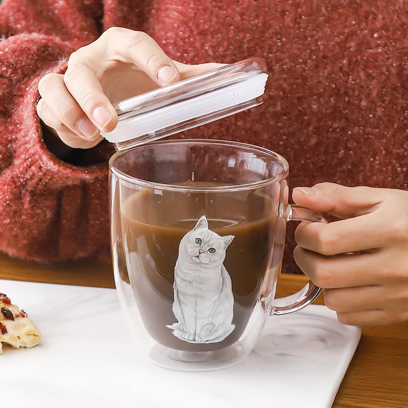 英短銀漸層貓咪水杯動物圖案雙層玻璃杯女可愛辦公室咖啡杯子網紅