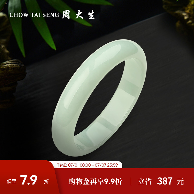 周大生天然翡翠手鐲女豆種白底平安玉鐲子送媽媽生日禮物送女朋友