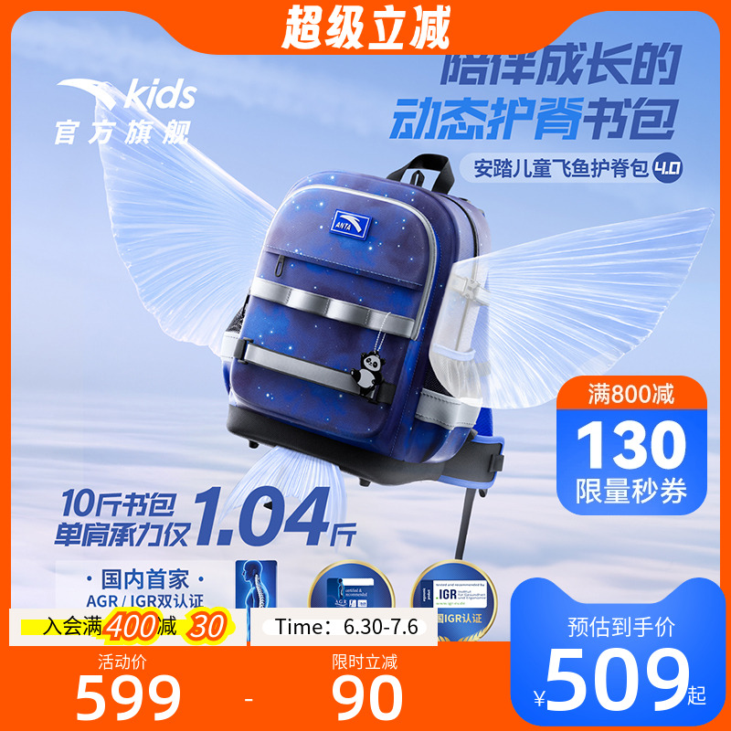 安踏兒童書包男小學生書包女生飛魚4.0雙肩包護脊減負背包3-6年級