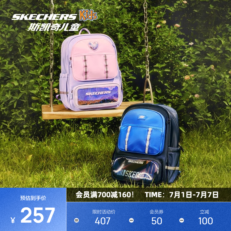 斯凱奇男女童雙肩包防沾水面料大容量時尚拼色設計潮流學生書包