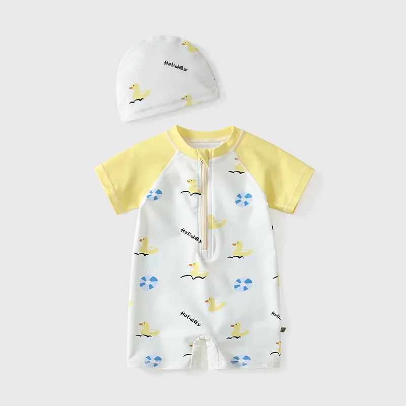 夏季新款兒童泳衣連體短袖速干游泳衣卡通小鴨子溫泉沙灘度假泳裝