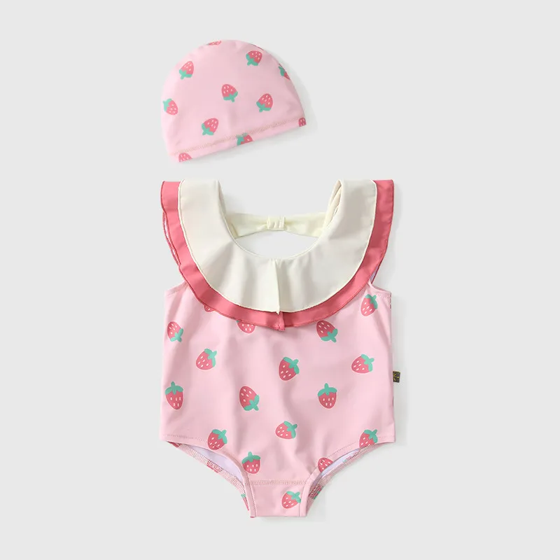 女童泳衣ins木耳邊連體泳裝25年夏季新款小草莓兒童游泳衣沙灘裝