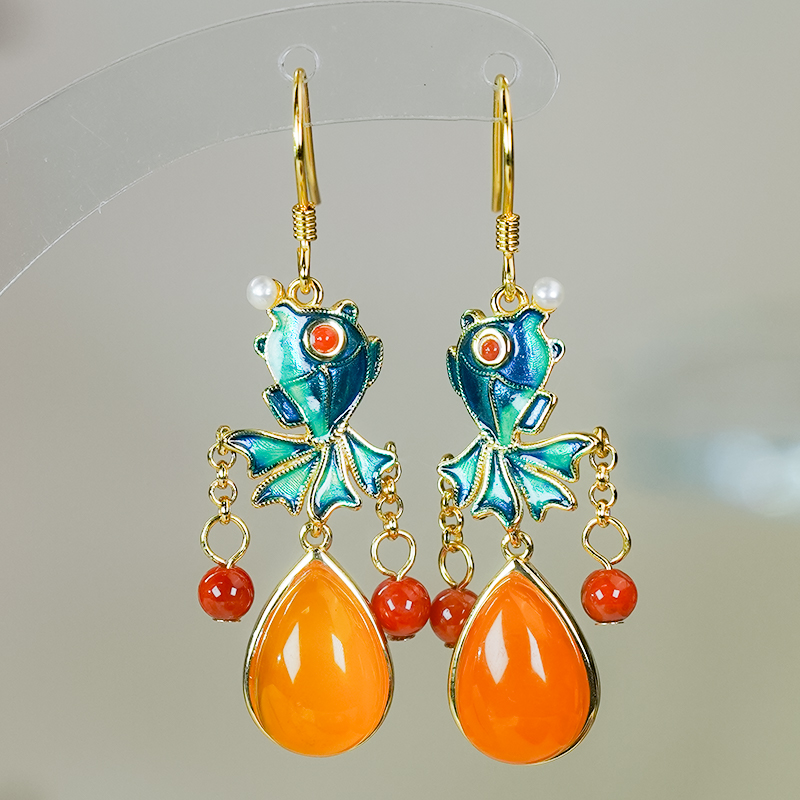 新中式景泰藍銀鑲嵌天然蜜蠟金魚設計滿蜜水滴耳環耳鉤款送媽媽