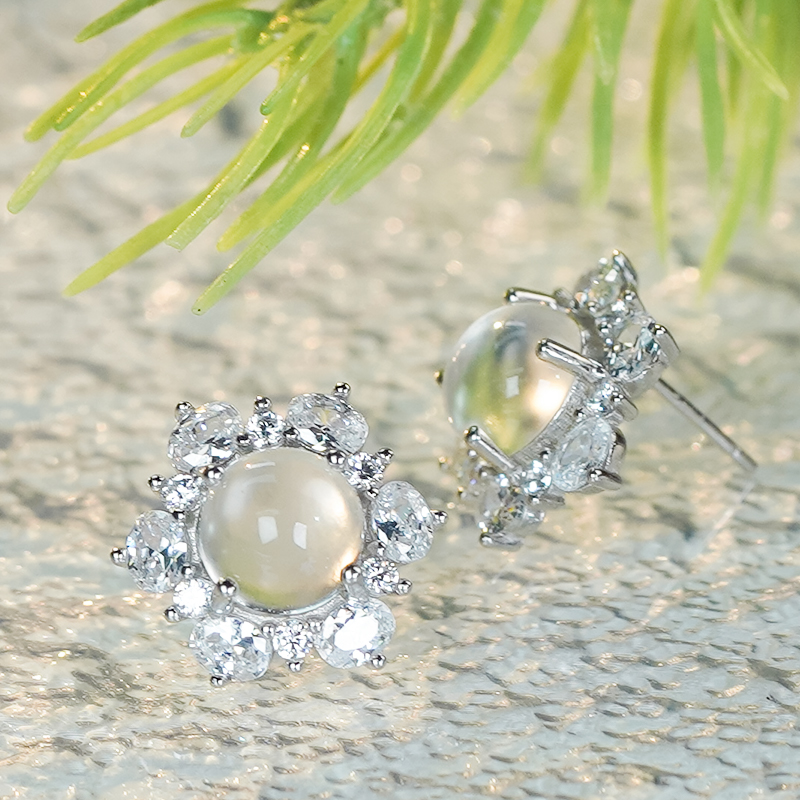 冰透石英質玉蛋面耳釘銀鑲嵌精致豪鑲太陽花耳飾