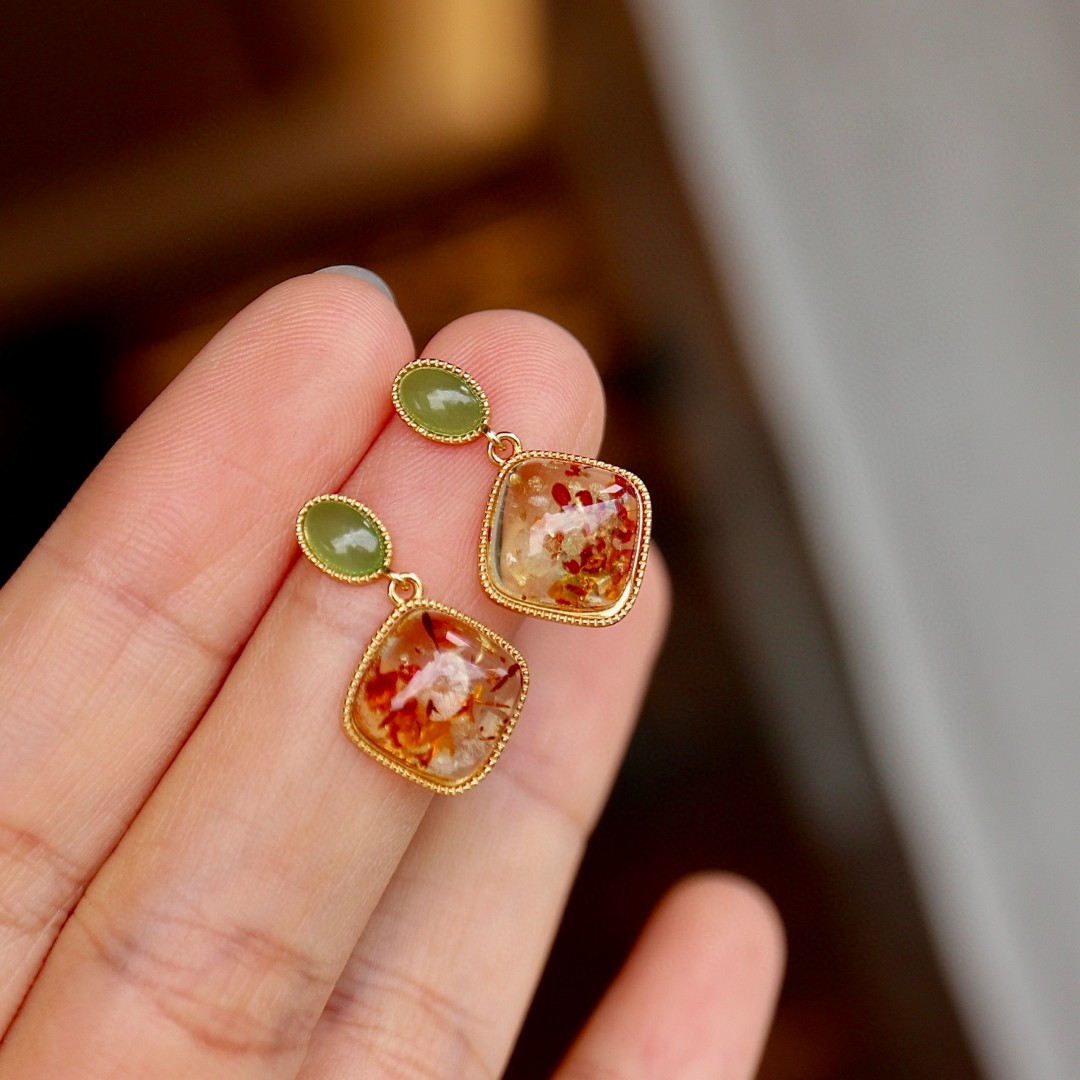 天然花珀方牌耳釘 約10mm S925純銀 點綴碧玉 花形唯美