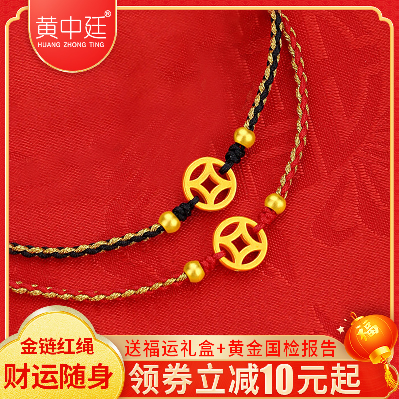 黃金銅錢紅繩腳鏈女轉運珠本命年紅繩手鏈999足金情人節生日禮物