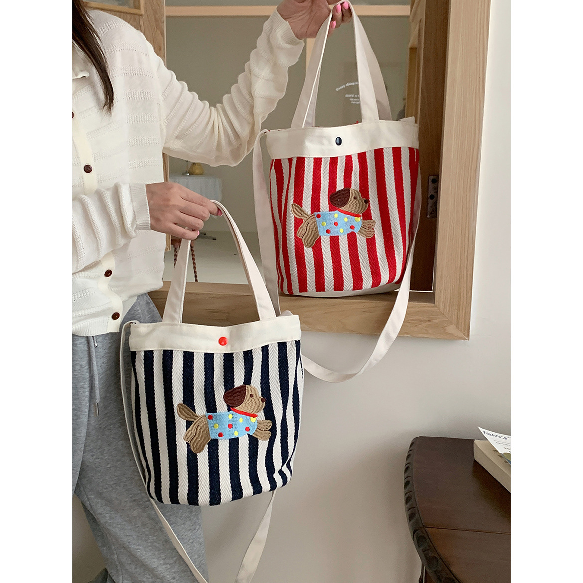 卡通小狗條紋圓桶包單肩斜挎水桶包媽咪遛彎包手提便當包帆布包女
