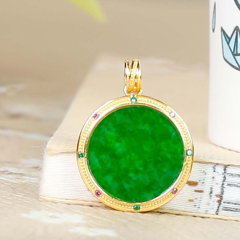 天然翡翠A貨銀鑲嵌精美高級感辣綠翡翠圓牌吊墜