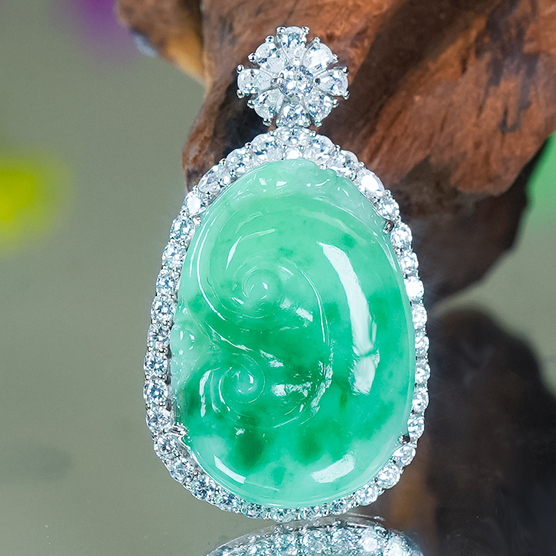 洛麗亞天然翡翠A貨銀鑲嵌冰潤大氣經典飄花翡翠如意玉吊墜送媽媽
