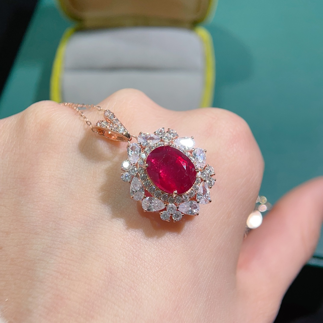 蜜安琪 戴妃款鴿血紅天然紅寶石吊墜18k 金鑲鉆石項鏈彩寶定制