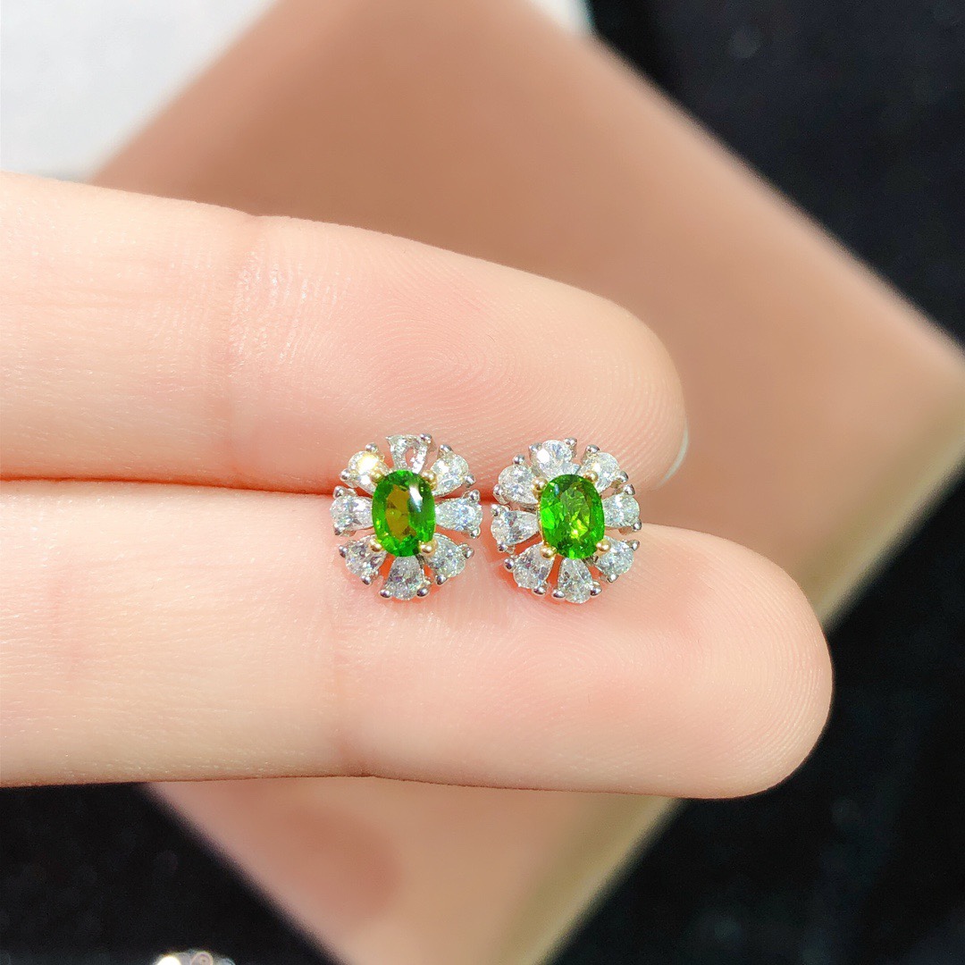 天然透輝石耳釘,925銀鑲嵌,925銀電鍍白金色,尺寸3*4mm