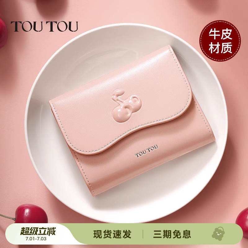 TOUTOU新款粉色真皮錢包卡包一體輕薄小巧女士零錢包生日結婚禮物