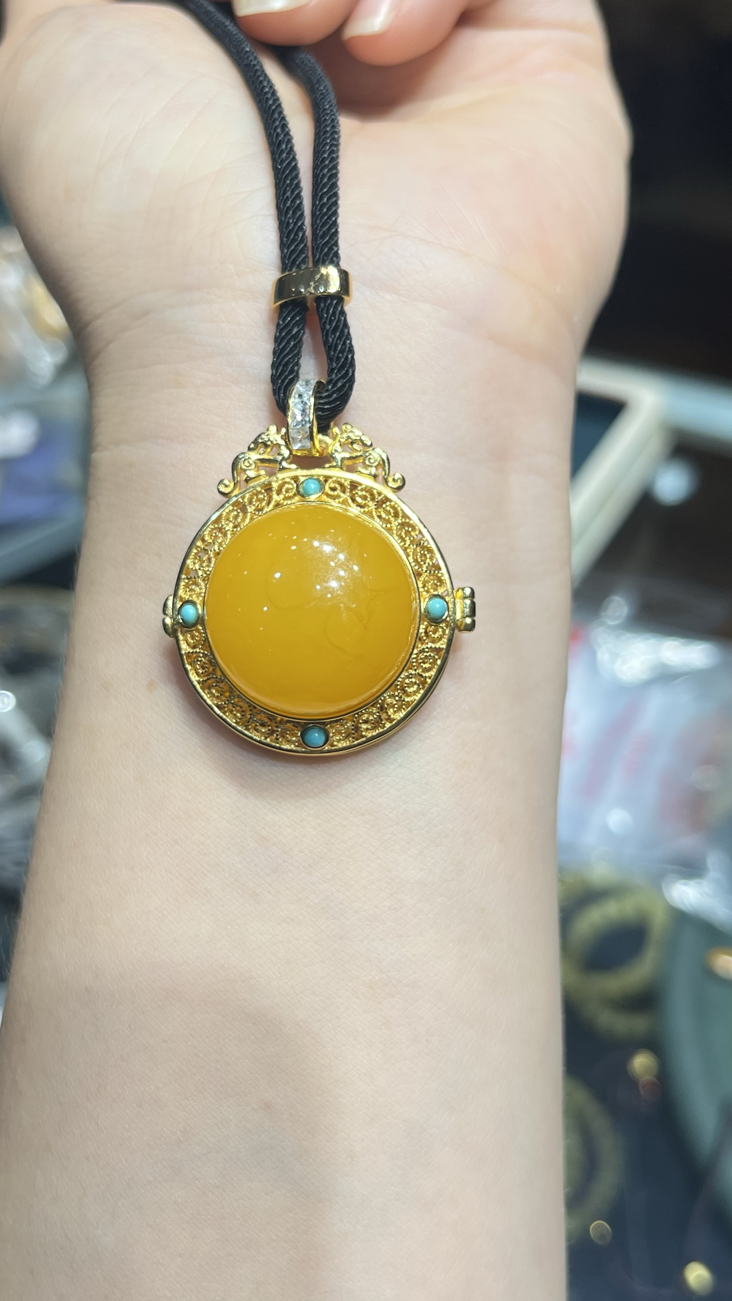 天然蜜蠟圓形吊墜雞油黃蜜蠟香囊吊墜毛衣鏈百搭送女友禮物保真