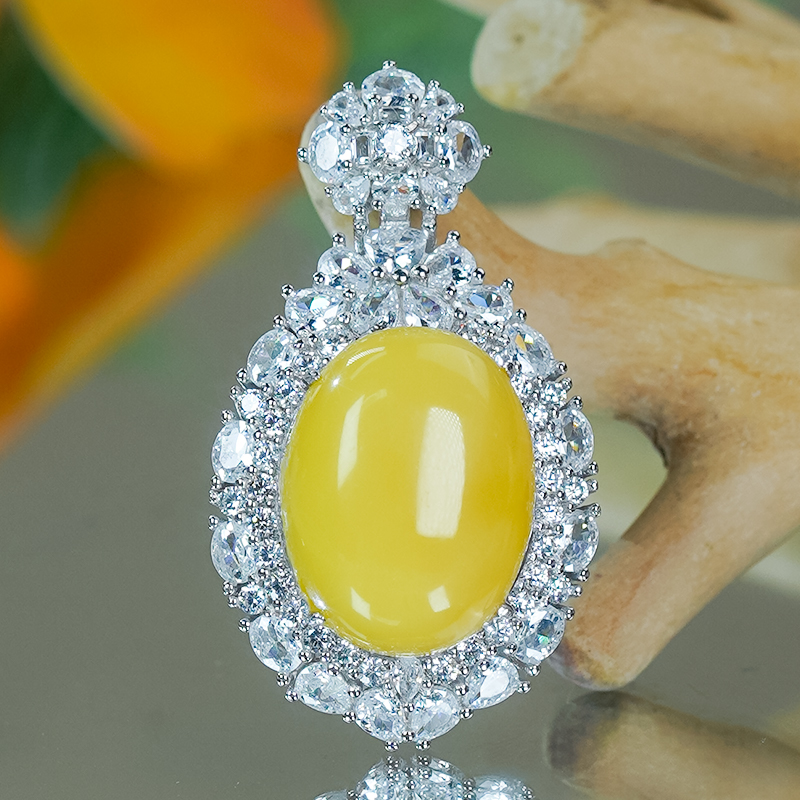 洛麗亞天然蜜蠟精致滿鋯豪鑲銀鑲大氣橢圓蛋面蜜蠟吊墜送老婆禮物