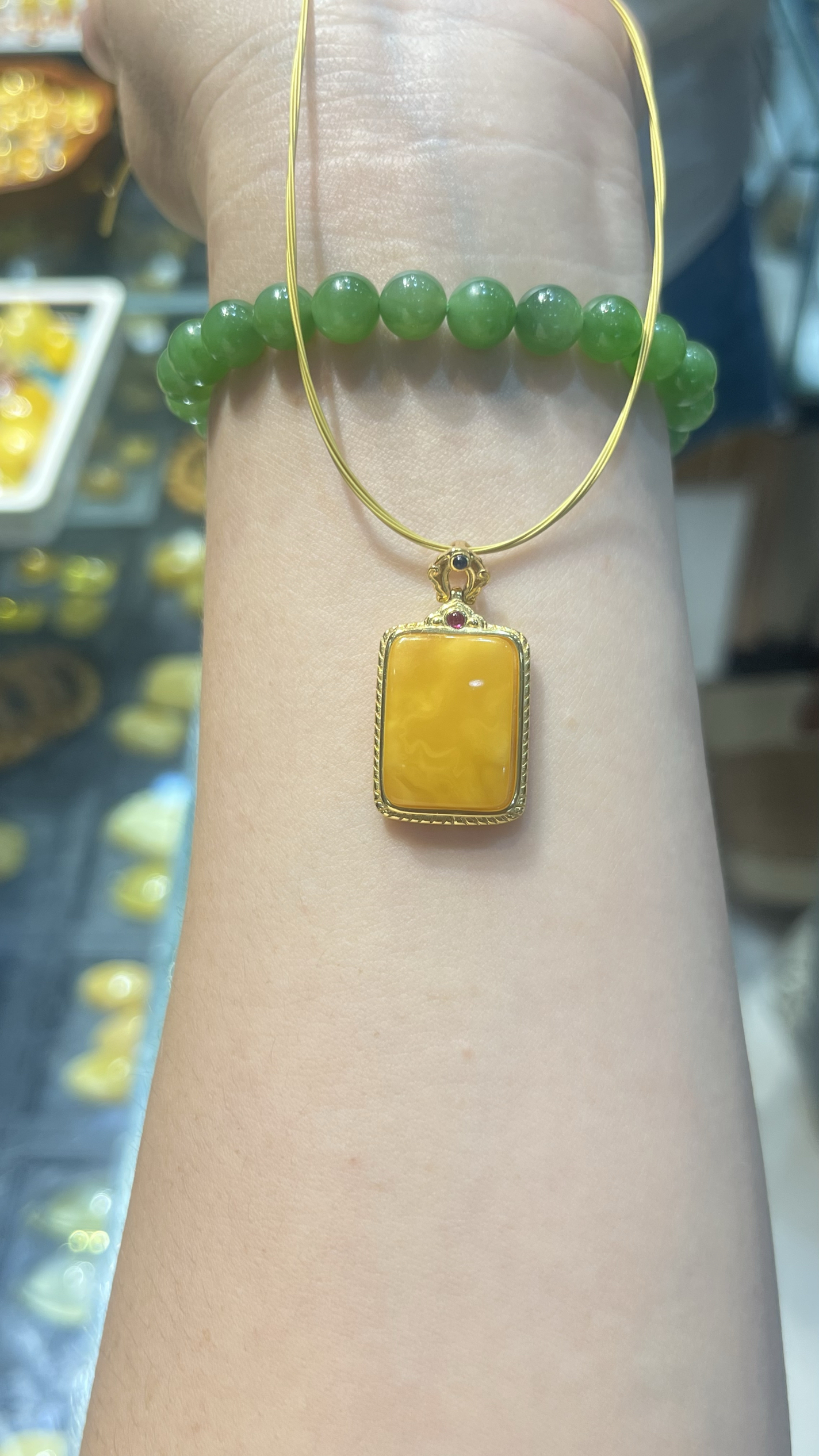 天然蜜蠟無事牌吊墜925銀鑲雞油黃蜜蠟無事牌吊墜送女友保真證書