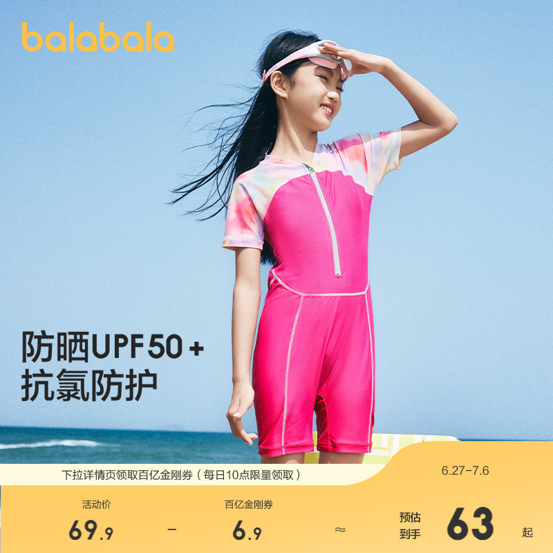 巴拉巴拉女童泳衣兒童泳裝中大童防曬連體泳裝撞色印花甜美俏皮潮