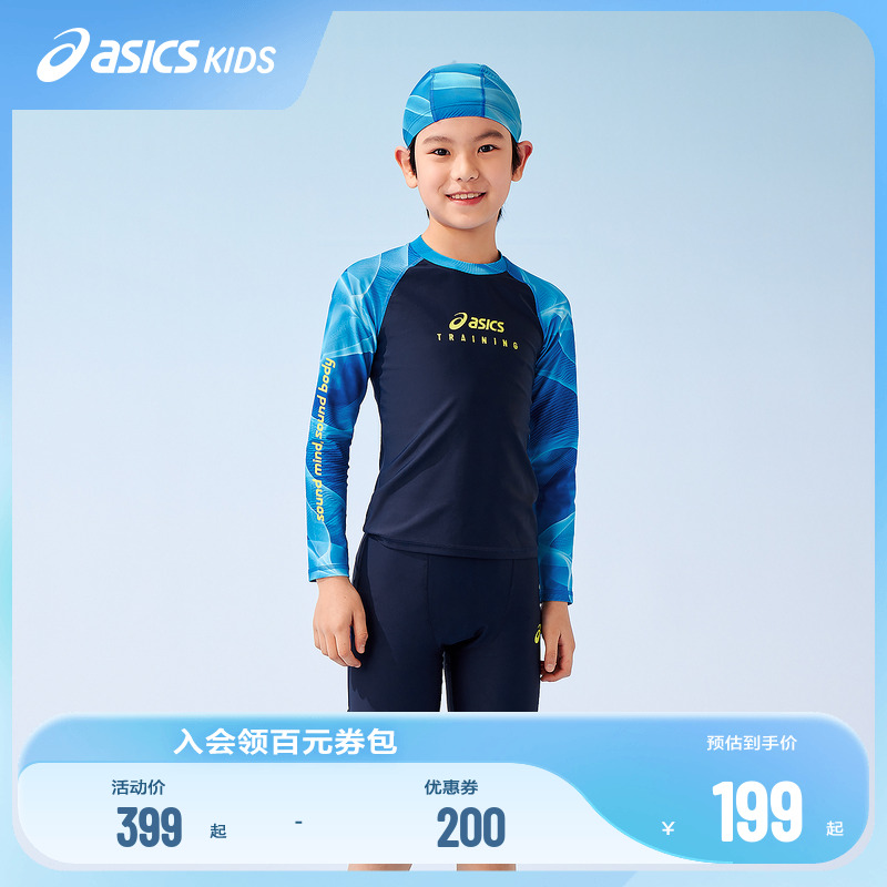 ASICS/亞瑟士兒童男女童夏季UPF50+彈力抗菌泳衣泳褲泳帽分體套裝