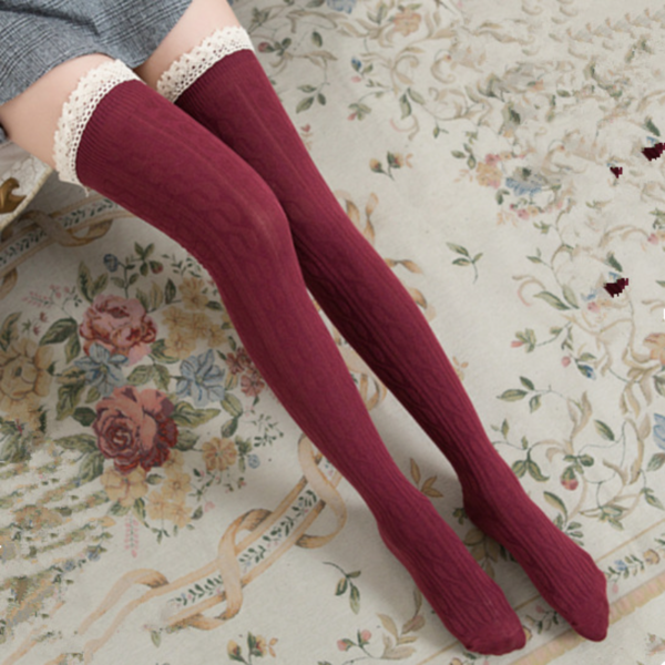 日系麻花人棉過膝襪廠家直銷少女提花打底襪花邊拼接襪子女