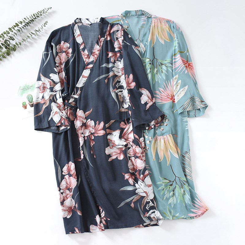日系和服睡袍人棉女睡衣春u夏薄綿綢中長款浴袍全棉大碼孕婦家居