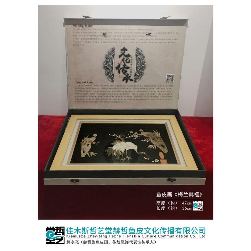 赫哲族魚皮畫 梅蘭鶴禧 解永亮作品 大馬哈魚皮 非遺手工收藏禮品