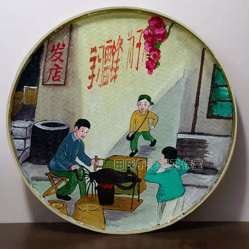 手繪簸箕竹編畫磨豆腐坊制作工序田園裝飾畫墻面掛件墻壁掛飾墻飾