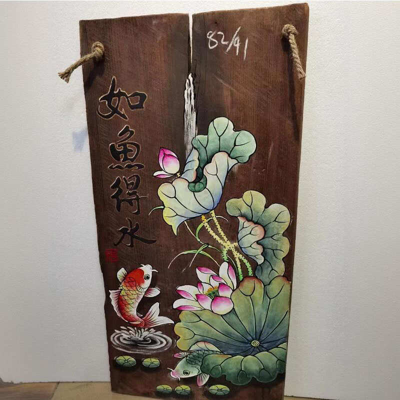 中式風化木板掛畫禪意荷花魚客廳裝飾畫復古手繪木板臥室客廳掛件