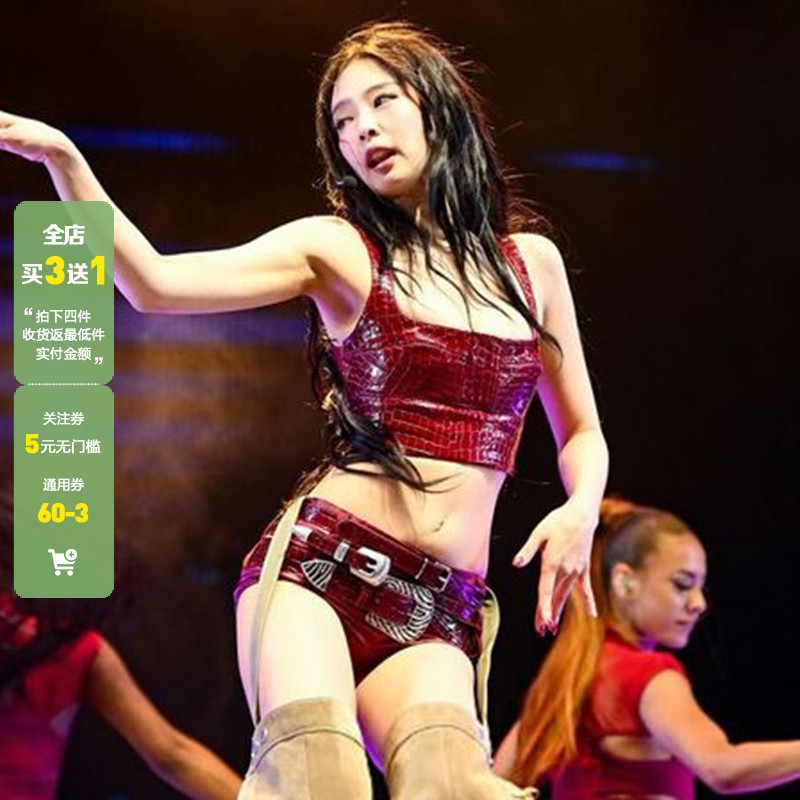 WEEKEEP 美式辣妹紅色鱷魚皮紋路吊帶背心+低腰包臀緊身短褲跳舞