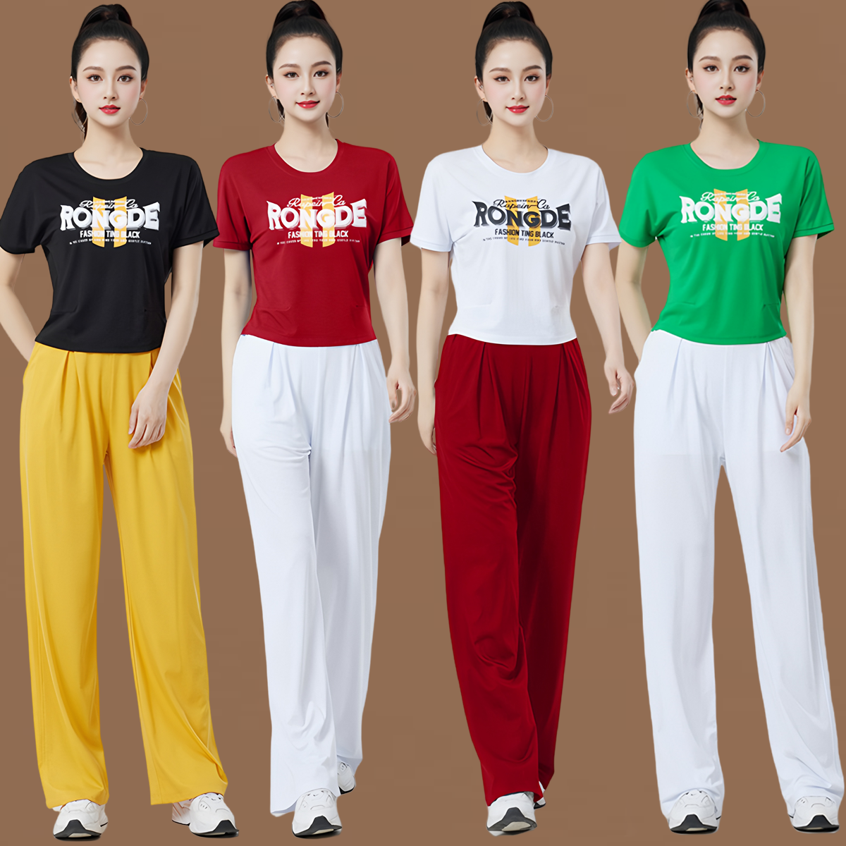 夏季新款跳舞純棉短袖上衣廣場舞速干長褲健身操跑步運動服套裝女
