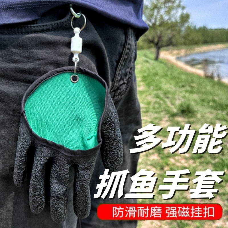 防滑抓魚手套路亞海釣摘魚乳膠起皺防滑防刺防扎防水加厚磁力扣抓