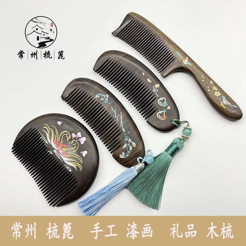 常州梳篦邢糧木藝非遺傳承黑檀木五經按摩梳子寬齒脫發頭部經絡梳