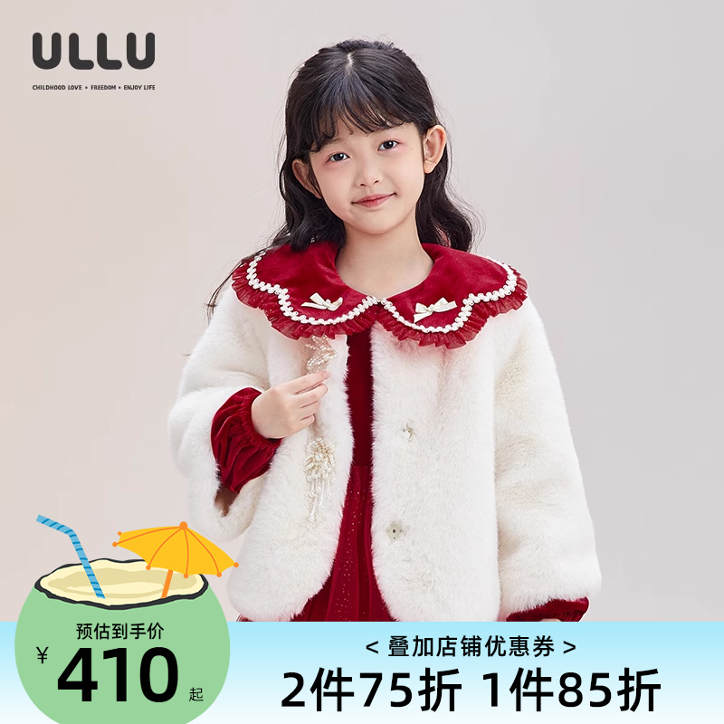 ULLU優露童裝女童長袖外套24冬款華麗珠花門襟扣短款環保皮草外套