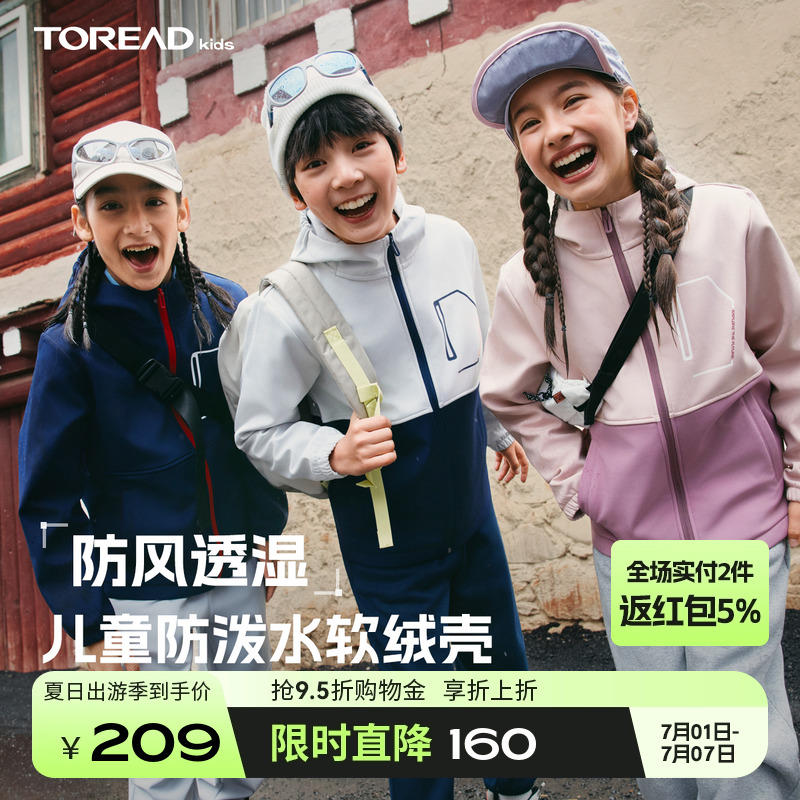 探路者兒童防潑水軟殼衣外套25年新款防風透濕男女童大童運動外套