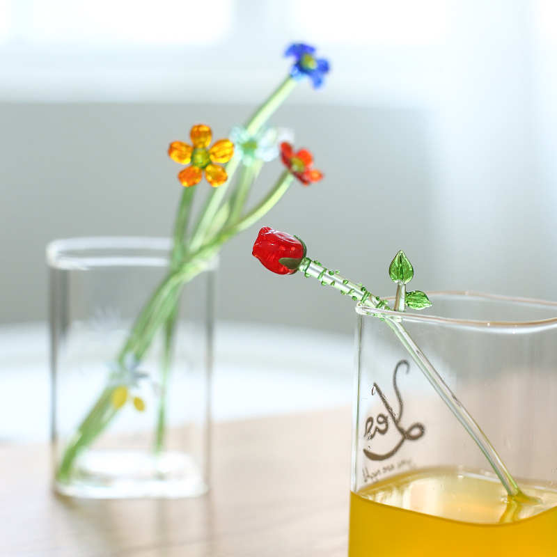 日式個性小清新杯子工藝品 防高溫防凍 花花玫瑰高硼硅玻璃攪拌棒