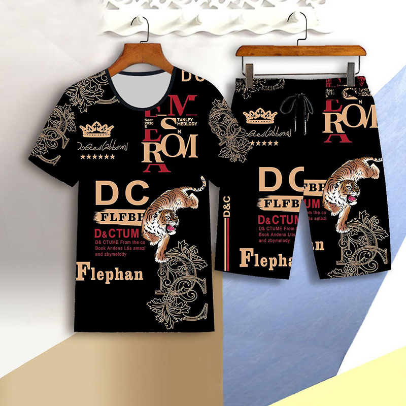 夏季新款冰絲透氣男士短袖短褲套裝時尚印花爆款運動服龍豹子圖案