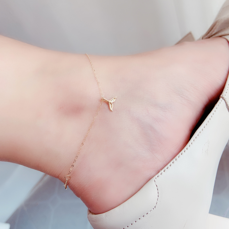 韓國純14K黃金腳鏈女 人魚吊墜光面鯨魚尾巴吊墜海豚魚尾腳鏈禮物