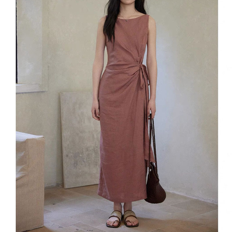 貳羊設計樂薇100亞麻圓領無袖連衣裙女系帶收腰通勤百搭裙子