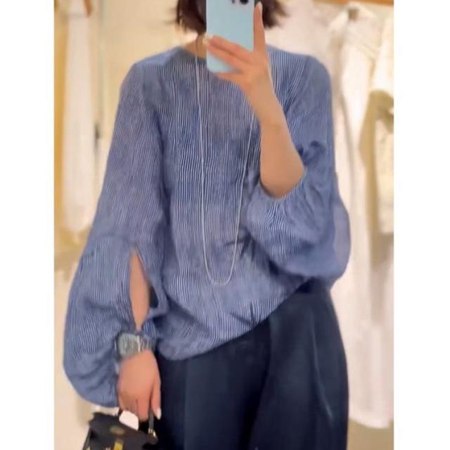 今年流行漂亮洋氣獨特別致上衣小眾設計感寬松顯瘦燈籠袖藍色襯衫