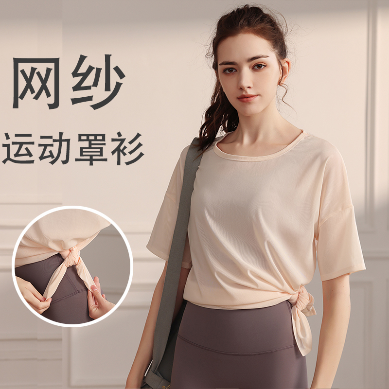 輕薄微透寬松瑜伽短袖速干網紗休閑運動長款時尚半袖跑步健身罩衫
