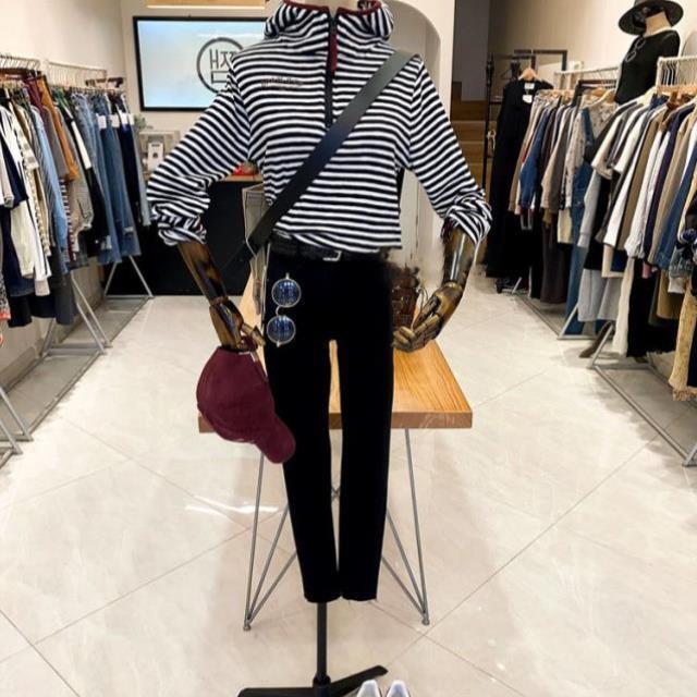 2024年秋冬季新款歐貨高級感洋氣時尚黑白條紋半拉鏈連帽長袖上衣