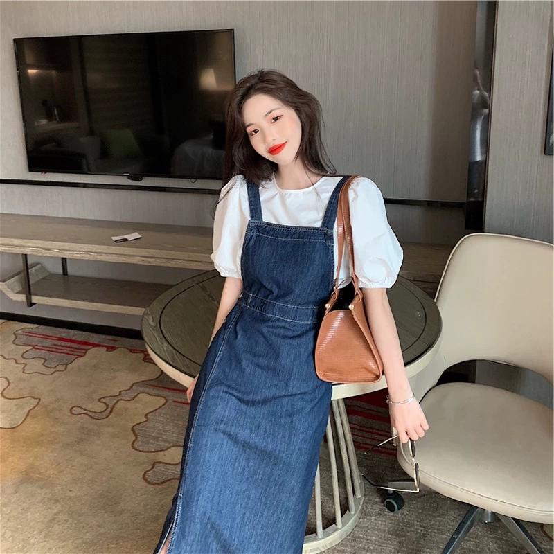 小個子法式復古氣質收腰顯瘦減齡開叉背帶牛仔連衣裙子女2025新款
