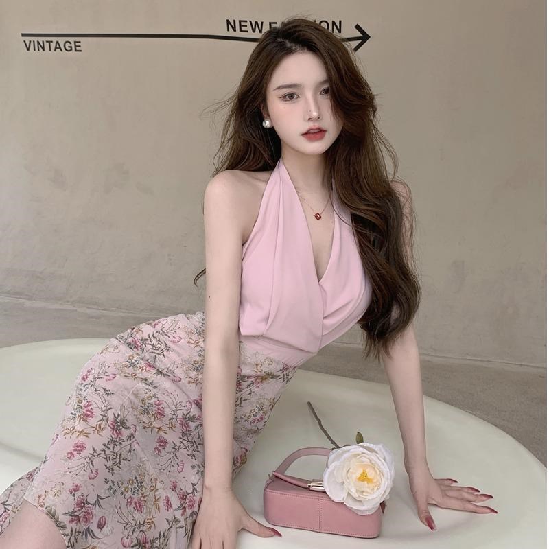 2023年新款溫柔風碎花禮服套裝法式復古開叉女神范U長裙打底連衣